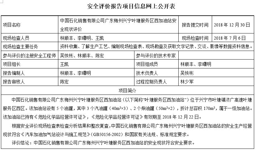 中国石化销售有限公司广东梅州兴宁叶塘服务区西加油站安全现状评价