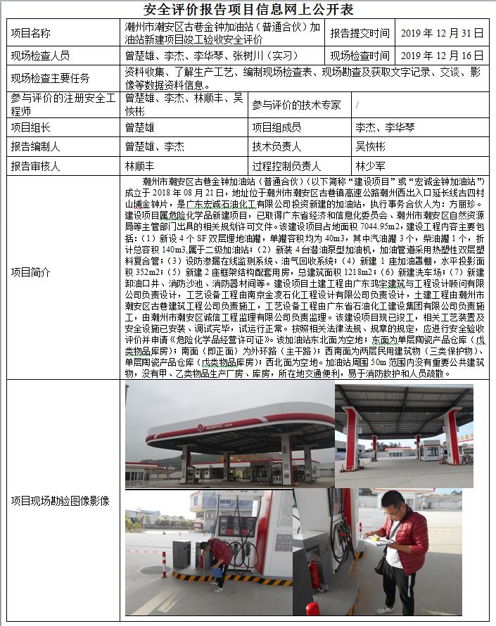 潮州市潮安区古巷金钟加油站(普通合伙)加油站新建项目竣工验收安全评价