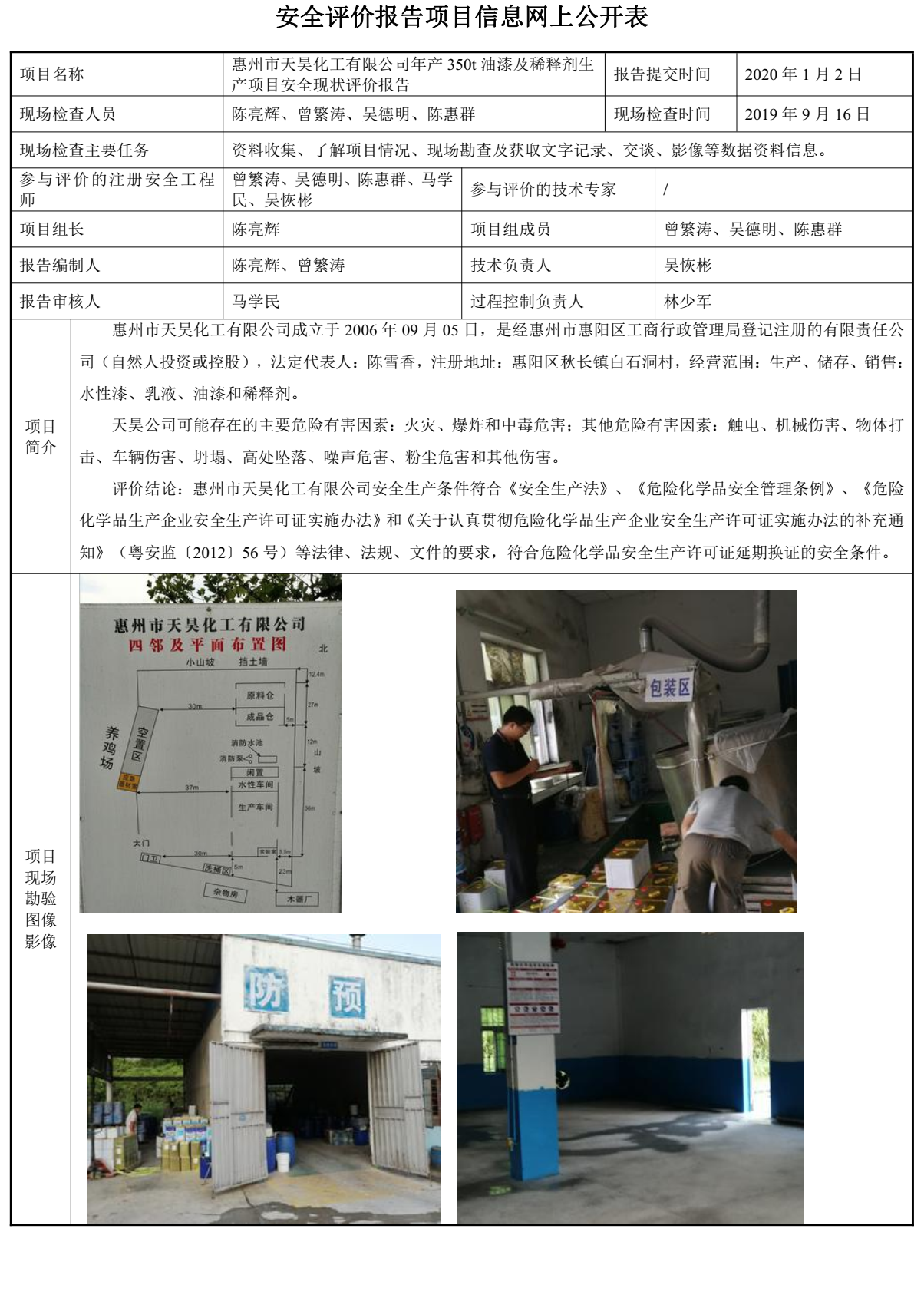 惠州市天昊化工有限公司年产350t油漆及稀释剂生产项目安全现状评价