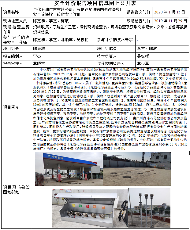 中化石油广东有限公司汕头快达加油站防渗改造项目安全设施竣工验收安全评价