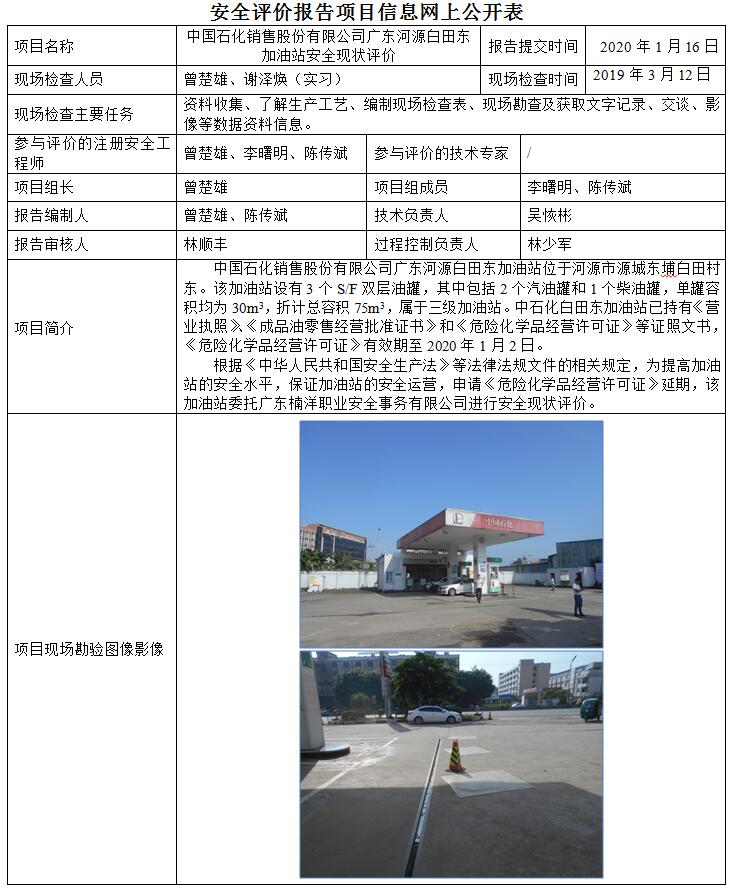 中国石化销售股份有限公司广东河源白田东加油站安全现状评价