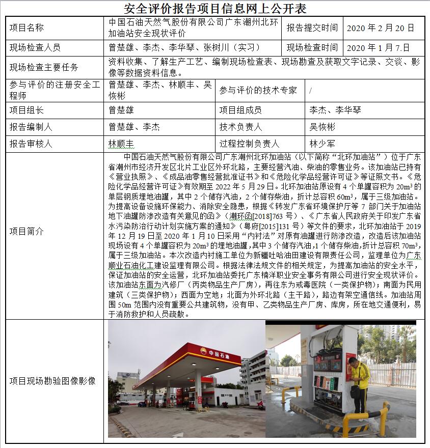 中国石油天然气股份有限公司广东潮州北环加油站安全现状评价