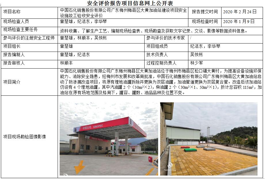 中国石化销售股份有限公司广东梅州梅县区大黄加油站建设项目安全设施竣工验收安全评价
