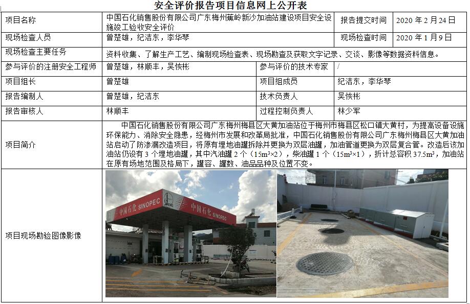 中国石化销售股份有限公司广东梅州蕉岭新沙加油站建设项目安全设施竣工验收安全评价