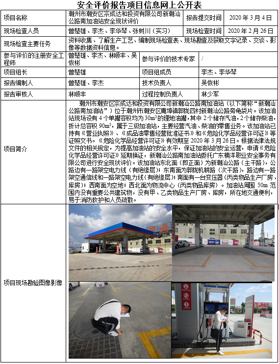 潮州市潮安区宗成达和投资有限公司新潮汕公路南加油站安全现状评价