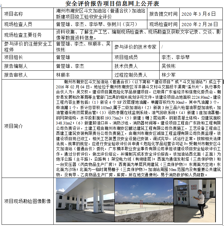 潮州市潮安区斗文加油站(普通合伙)加油站新建项目竣工验收安全评价