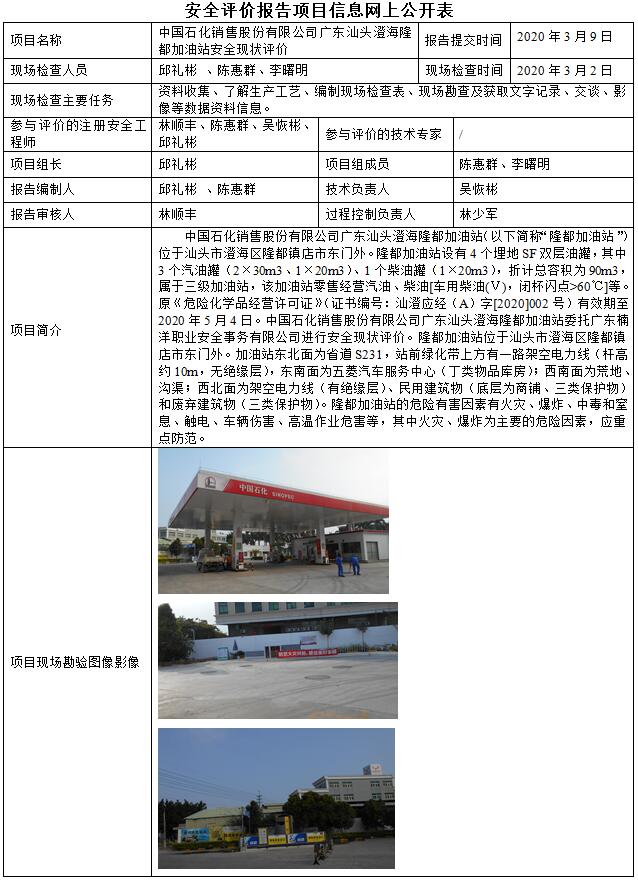 中国石化销售股份有限公司广东汕头澄海隆都加油站安全现状评价