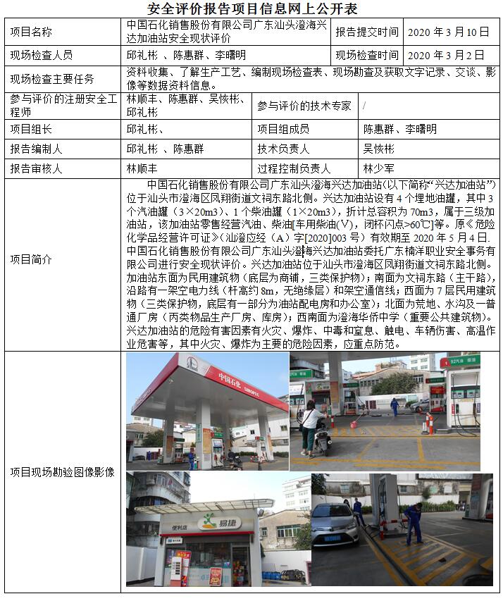 中国石化销售股份有限公司广东汕头澄海兴达加油站安全现状评价
