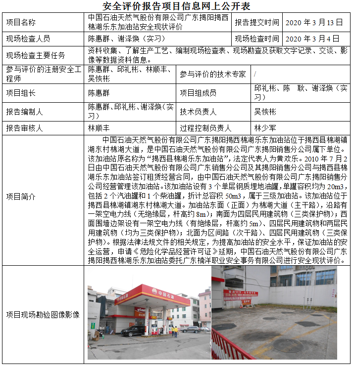 中国石油天然气股份有限公司广东揭阳揭西棉湖乐东加油站安全现状评价