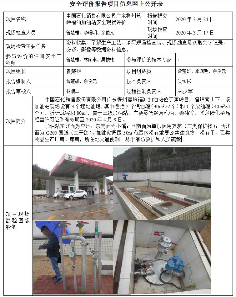 中国石化销售股份有限公司广东梅州蕉岭福汕加油站安全现状评价