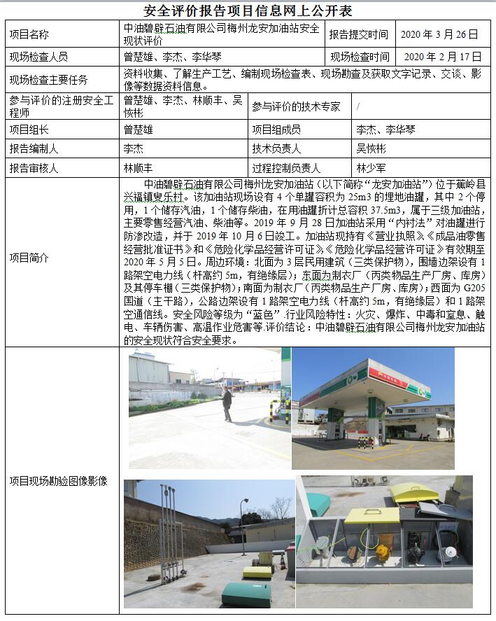 中油碧辟石油有限公司梅州龙安加油站安全现状评价