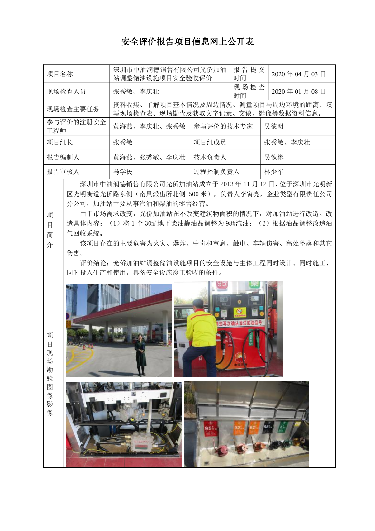 深圳市中油润德销售有限公司光侨加油站调整储油设施项目安全验收评价