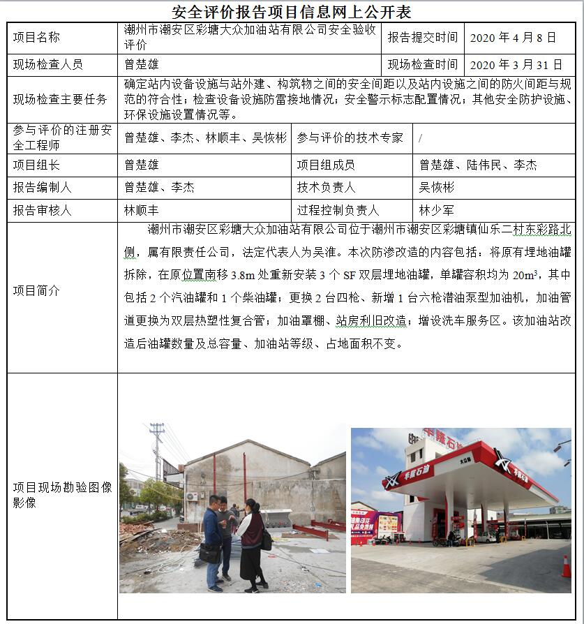 潮州市潮安区彩塘大众加油站有限公司安全验收评价