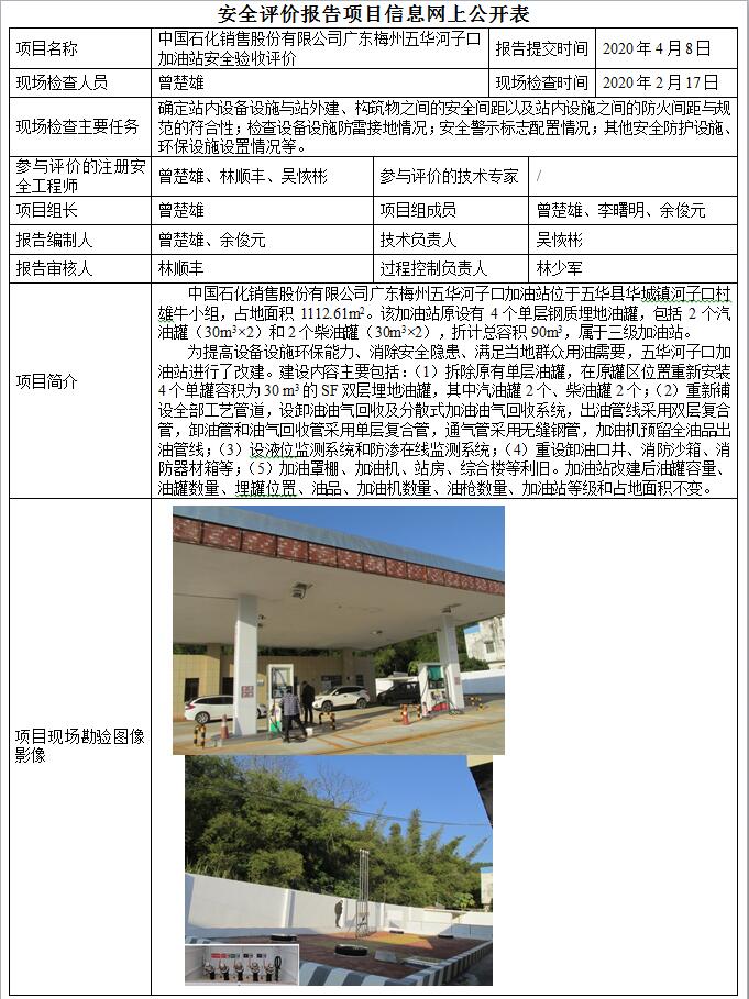 中国石化销售股份有限公司广东梅州五华河子口加油站建设项目安全设施竣工验收安全评价