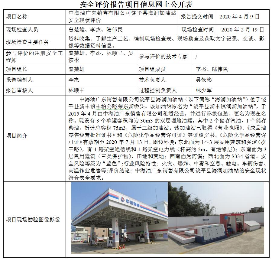 中海油广东销售有限公司饶平县海润加油站安全现状评价