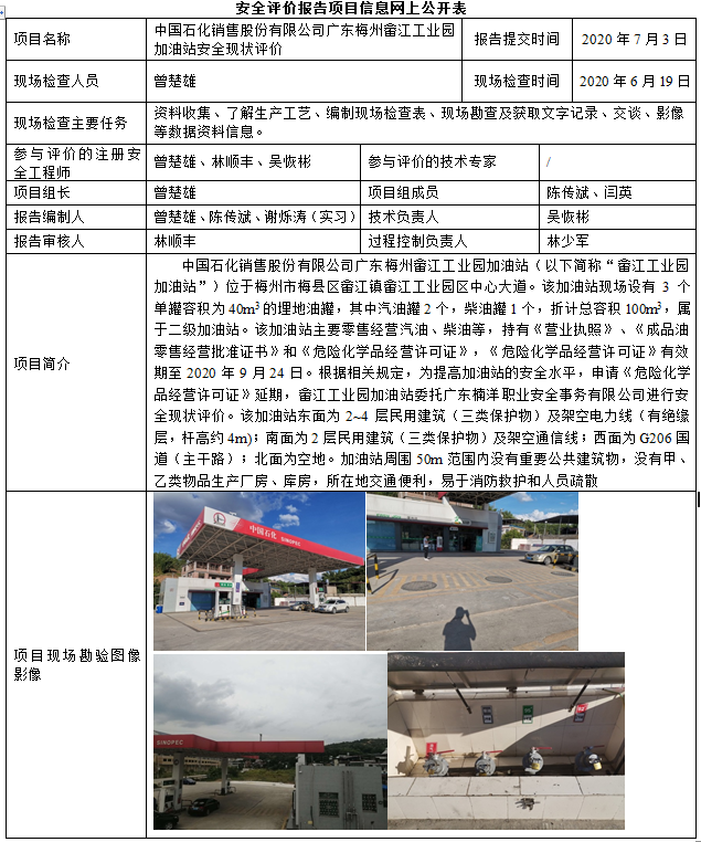 中国石化销售股份有限公司广东梅州畲江工业园加油站安全现状评价