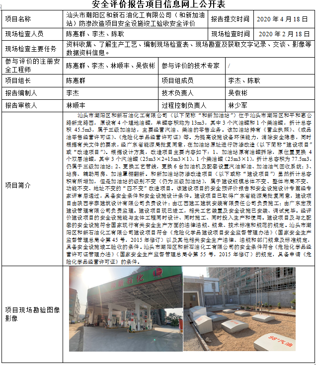 汕头市潮阳区和新石油化工有限公司(和新加油站)防渗改造项目安全设施竣工验收安全评价
