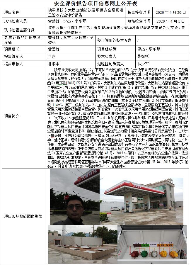 饶平县钱东大展加油站改建项目安全设施竣工验收安全评价