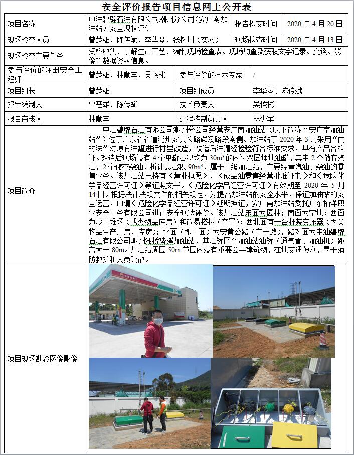 中油碧辟石油有限公司潮州分公司(安广南加油站)安全现状评价