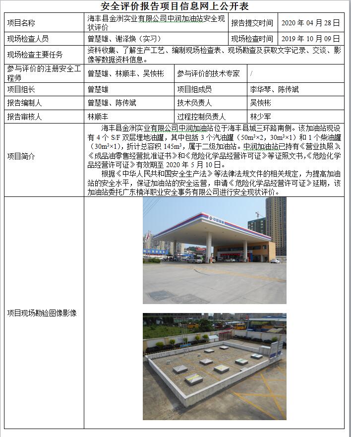 海丰县金洲实业有限公司中润加油站安全现状评价