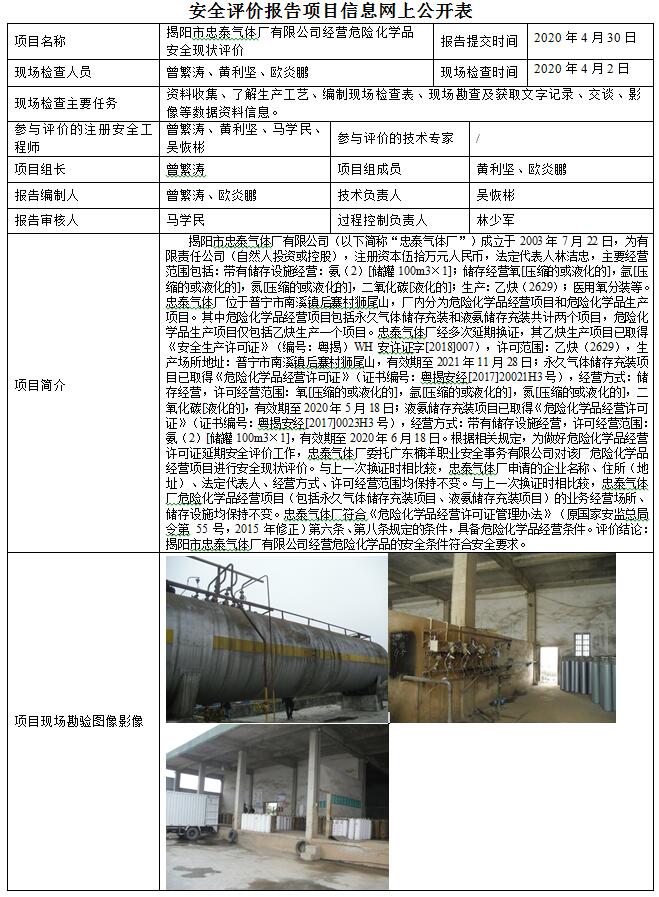 揭阳市忠泰气体厂有限公司经营危险化学品安全现状评价