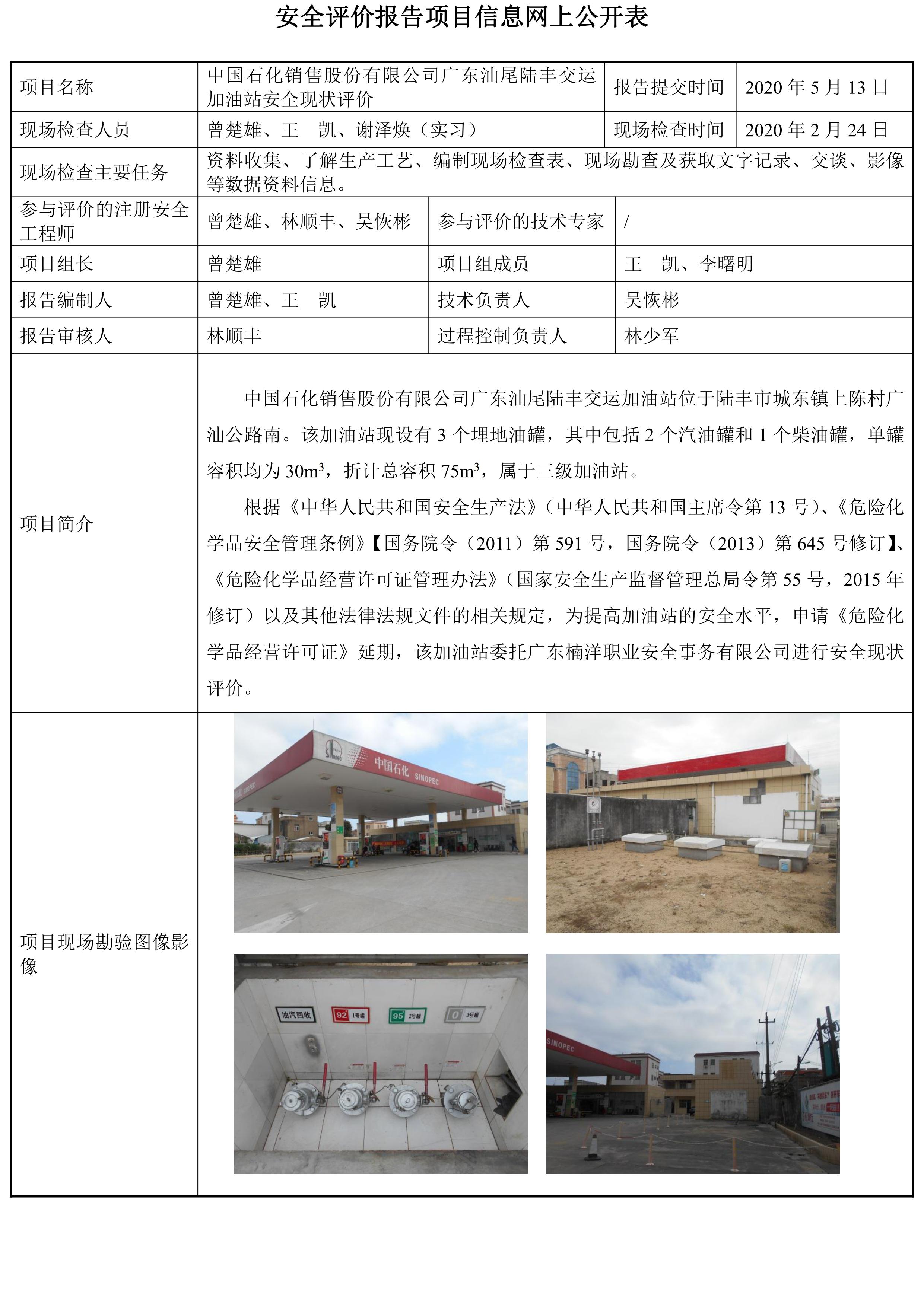 中国石化销售股份有限公司广东汕尾陆丰交运加油站安全现状评价