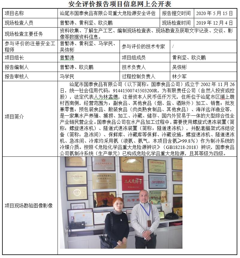 汕尾市国泰食品有限公司重大危险源安全评估