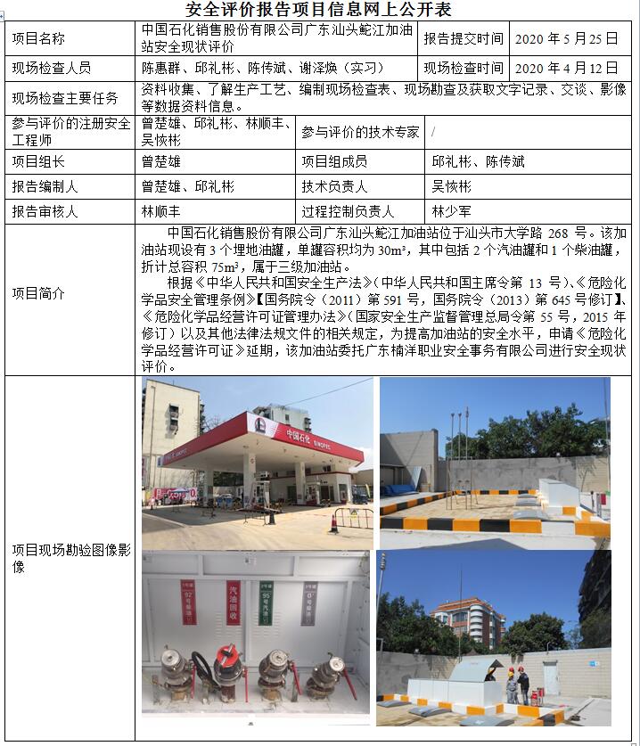 中国石化销售股份有限公司广东汕头鮀江加油站安全现状评价