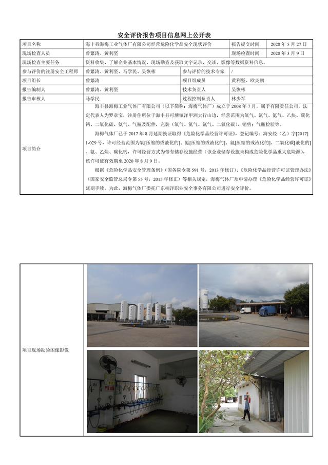海丰县海梅工业气体厂有限公司经营危险化学品安全现状评价