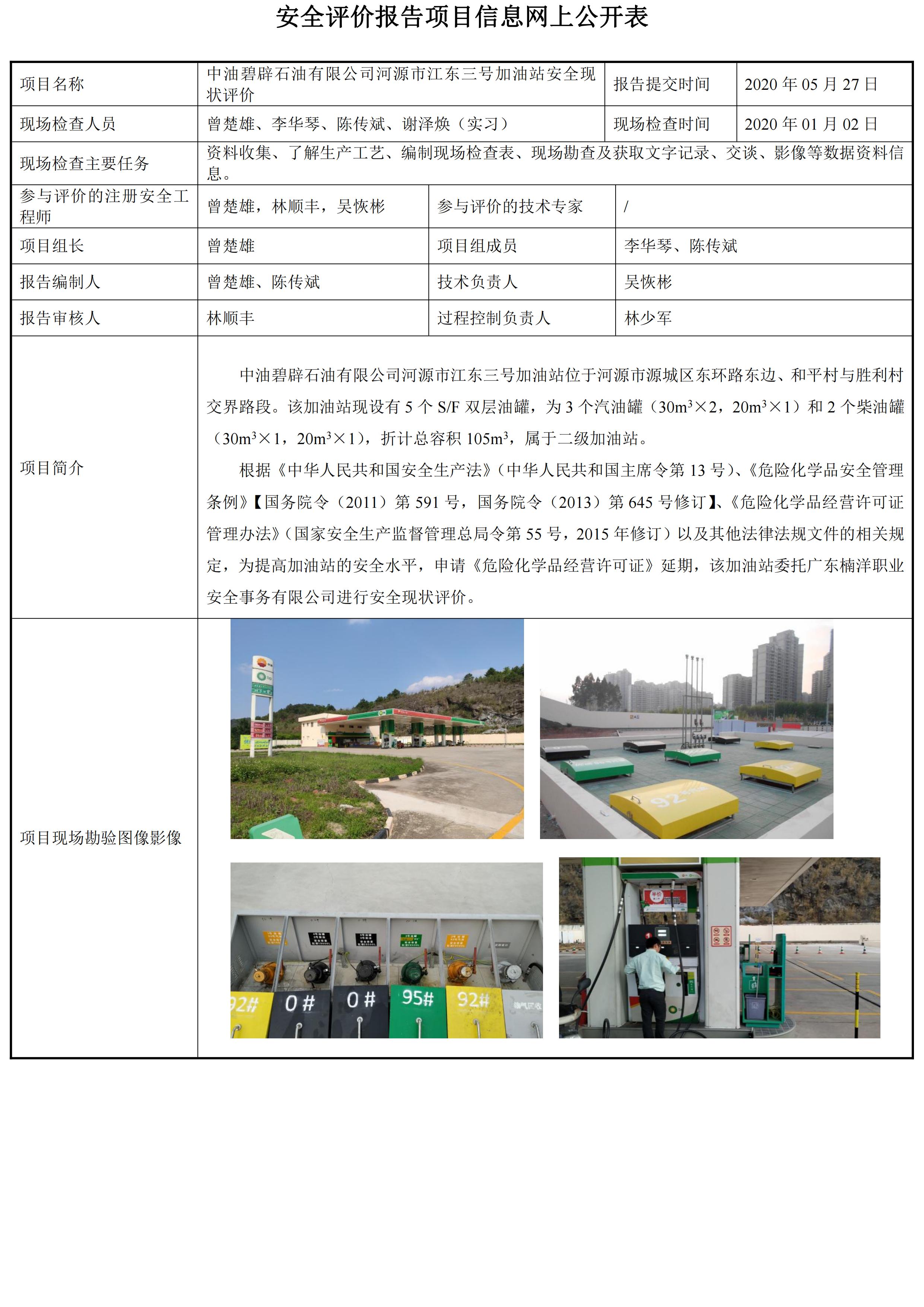 中油碧辟石油有限公司河源市江东三号加油站安全现状评价