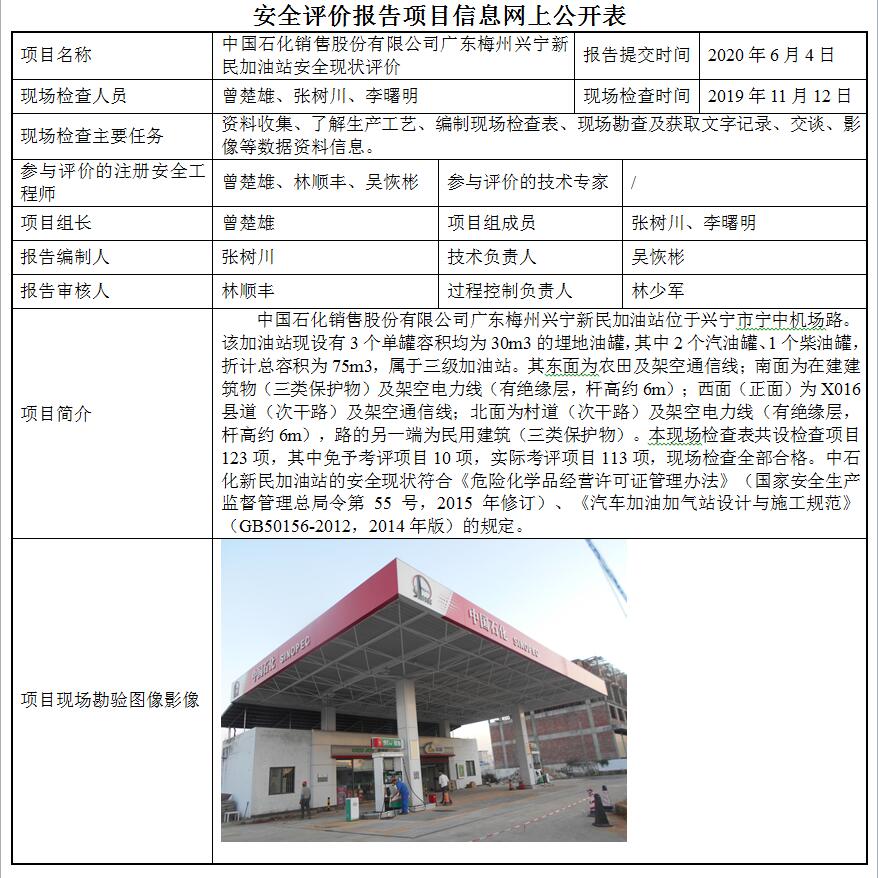 中国石化销售股份有限公司广东梅州兴宁新民加油站安全现状评价