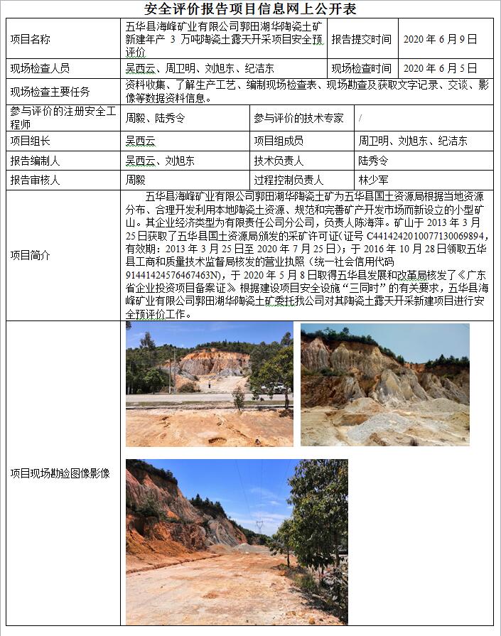 五华县海峰矿业有限公司郭田湖华陶瓷土矿新建年产3万吨陶瓷土露天开采项目安全预评价
