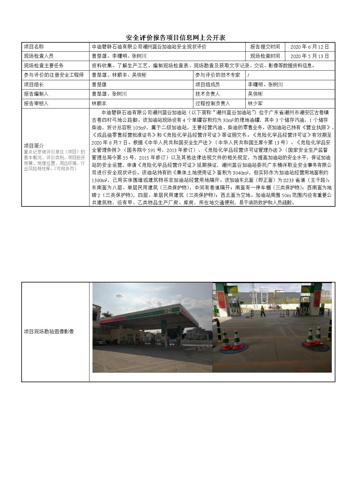 中油碧辟石油有限公司潮州蓝谷加油站安全现状评价