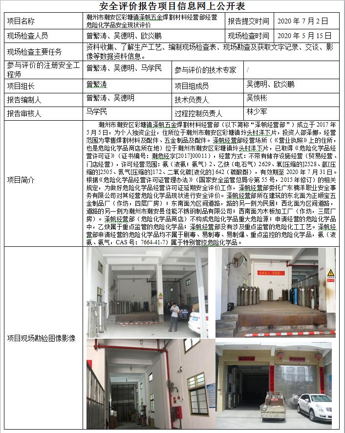 潮州市潮安区彩塘镇泽帆五金焊割材料经营部经营危险化学品安全现状评价