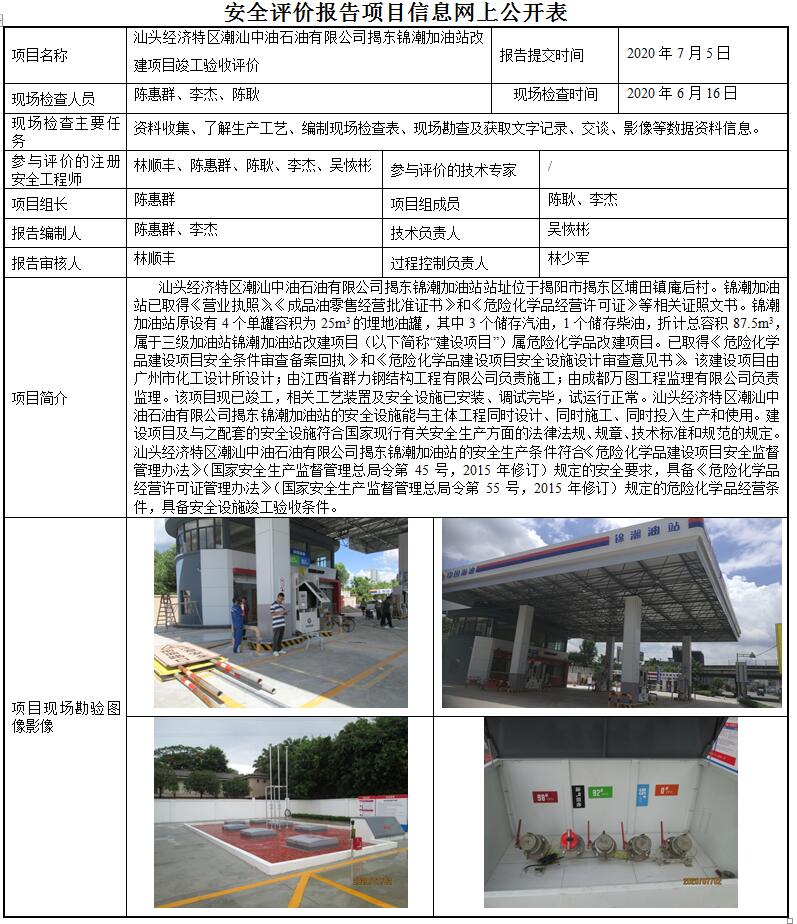 汕头经济特区潮汕中油石油有限公司揭东锦潮加油站改建项目安全设施竣工验收安全评价