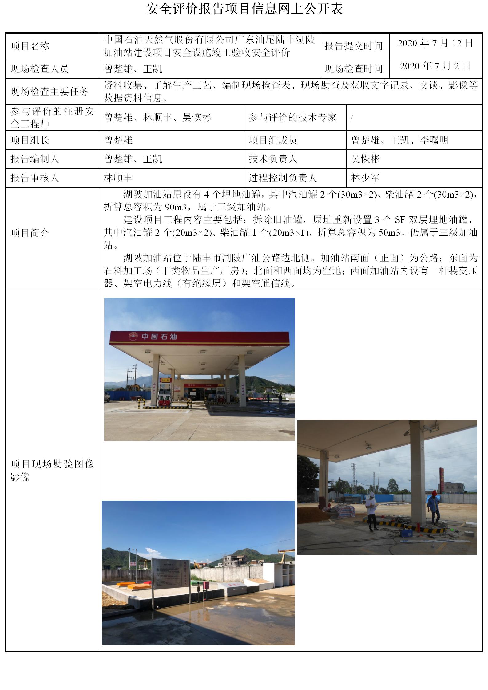 中国石油天然气股份有限公司广东汕尾陆丰湖陂加油站建设项目安全设施竣工验收安全评价