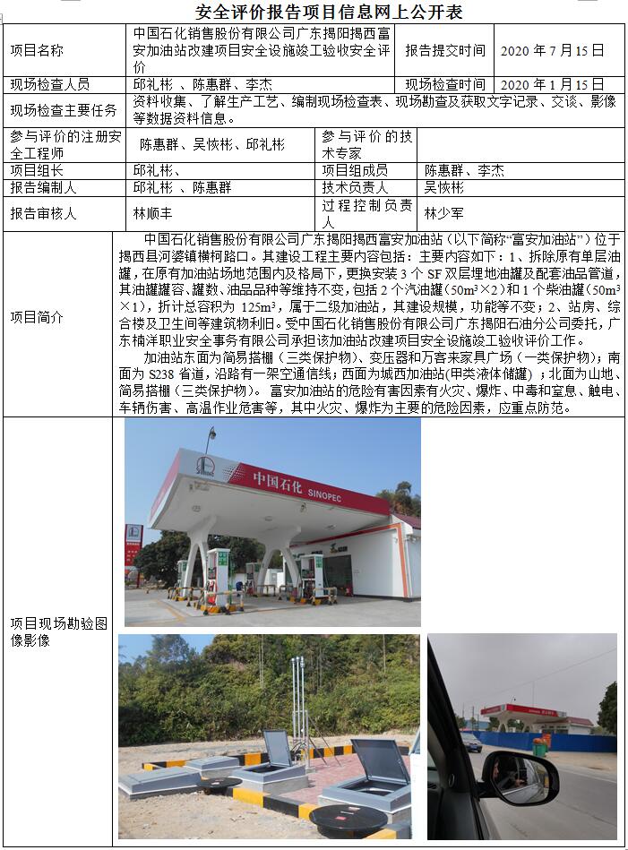 中国石化销售股份有限公司广东揭阳揭西富安加油站改建项目安全设施竣工验收安全评价