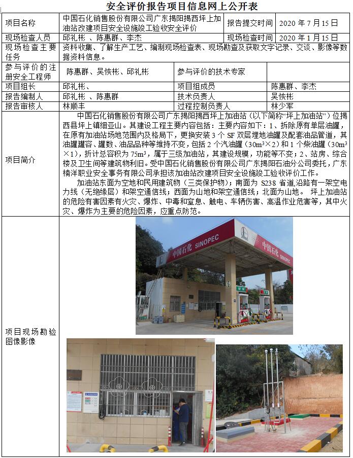 中国石化销售股份有限公司广东揭阳揭西坪上加油站改建项目安全设施竣工验收安全评价