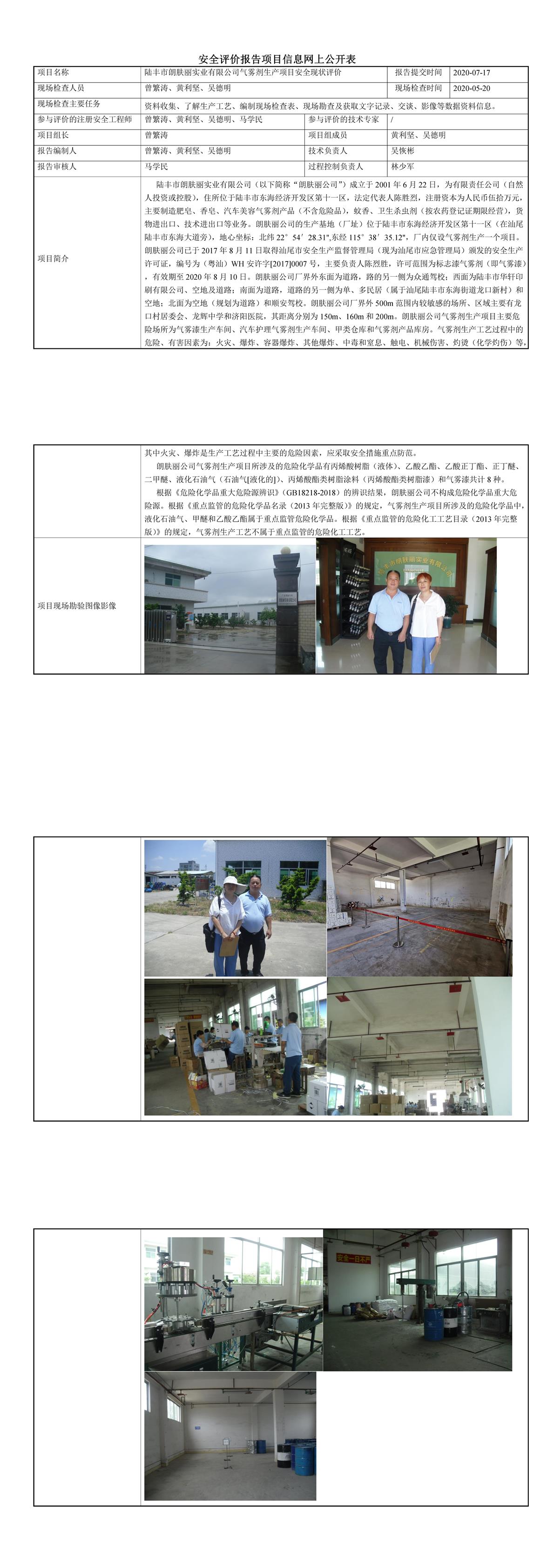 陆丰市朗肤丽实业有限公司气雾剂生产项目安全现状评价