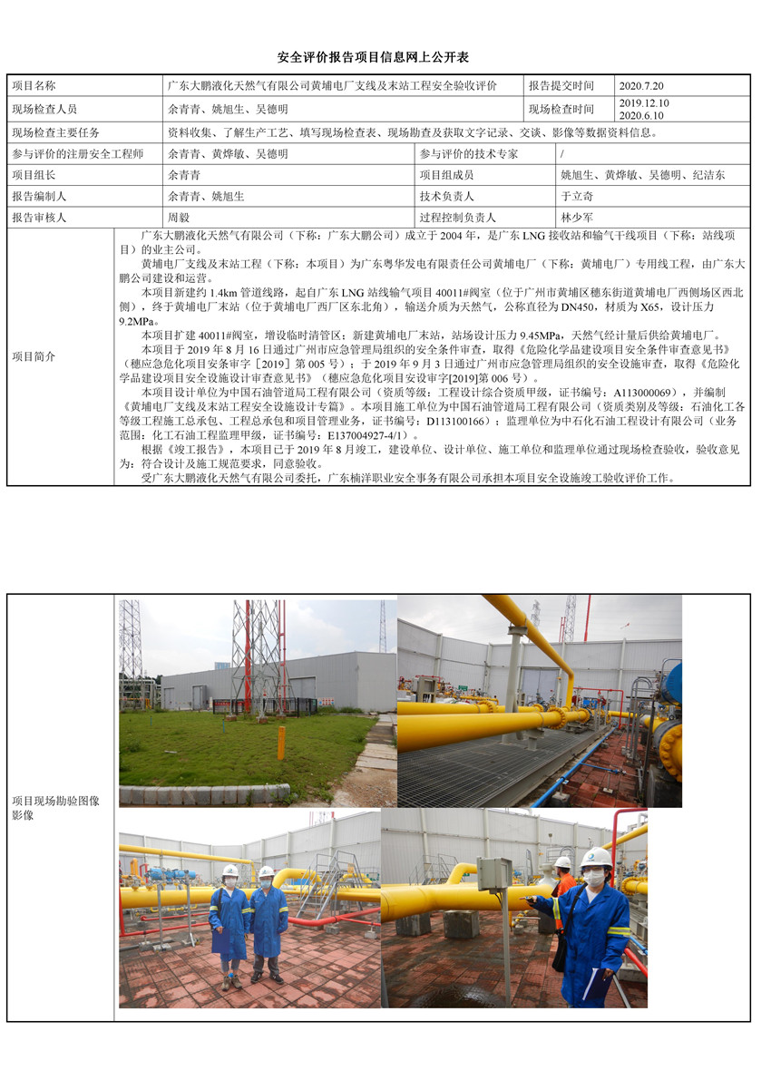 广东大鹏液化天然气有限公司黄埔电厂支线及末站工程安全验收评价