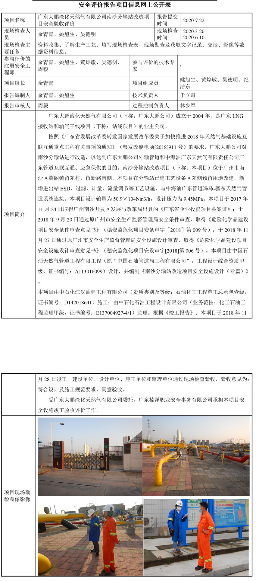 广东大鹏液化天然气有限公司南沙分输站改造项目安全验收评价