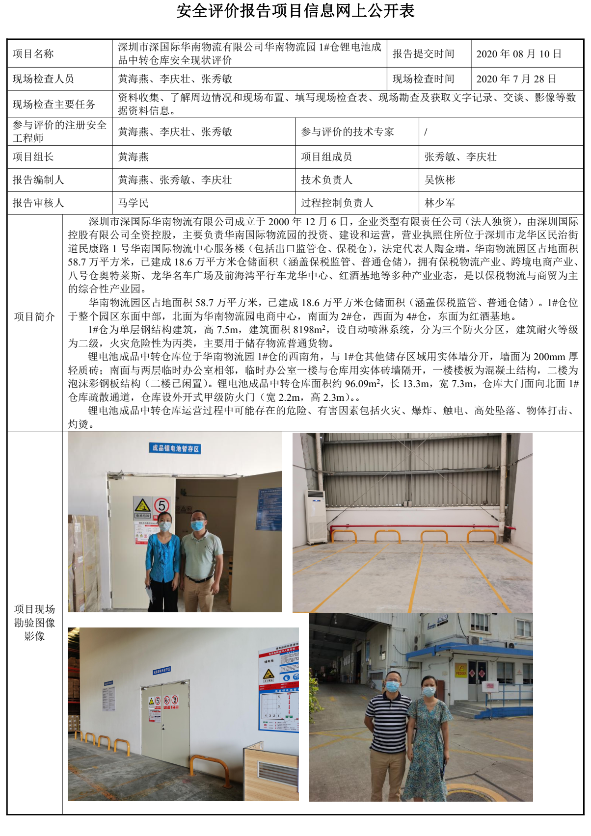 深圳市深国际华南物流有限公司华南物流园1#仓锂电池成品中转仓库安全现状评价