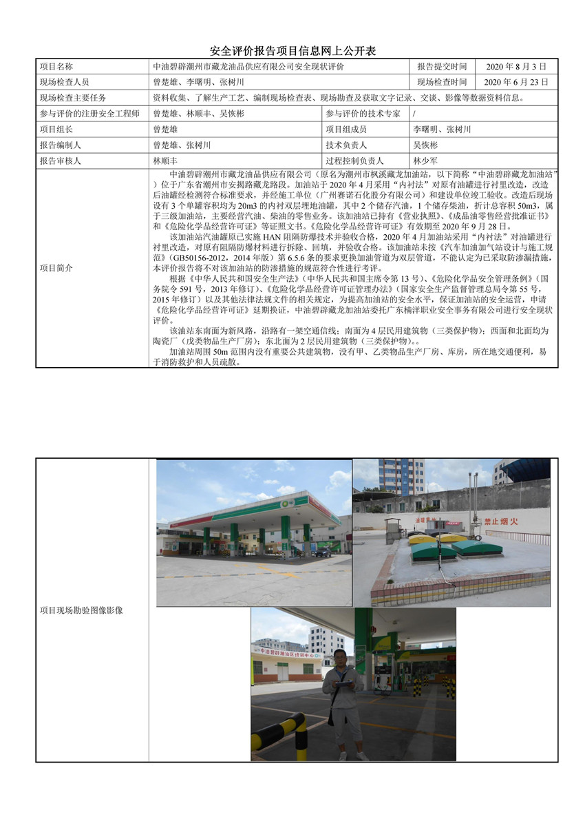 中油碧辟潮州市藏龙油品供应有限公司(藏龙加油站)安全现状评价