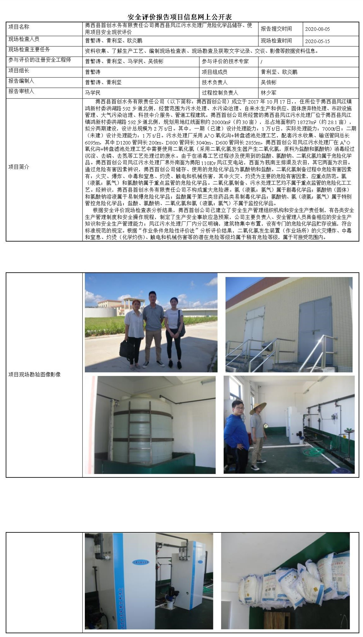 揭西县首创水务有限责任公司揭西县凤江污水处理厂危险化学品储存、使用项目安全现状评价