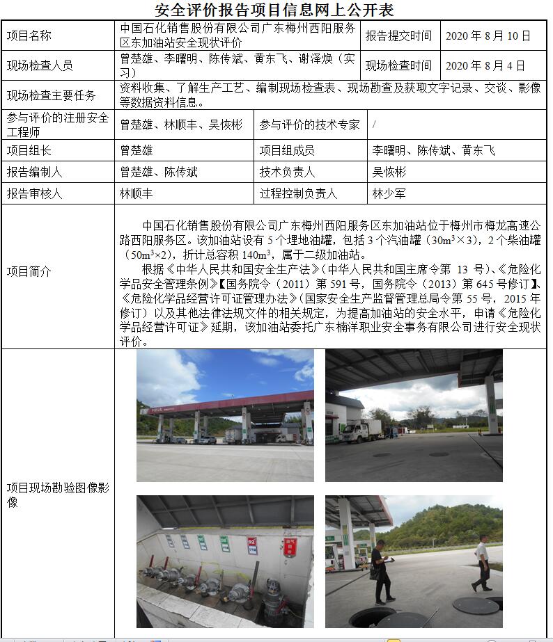 中国石化销售股份有限公司广东梅州西阳服务区东加油站安全现状评价