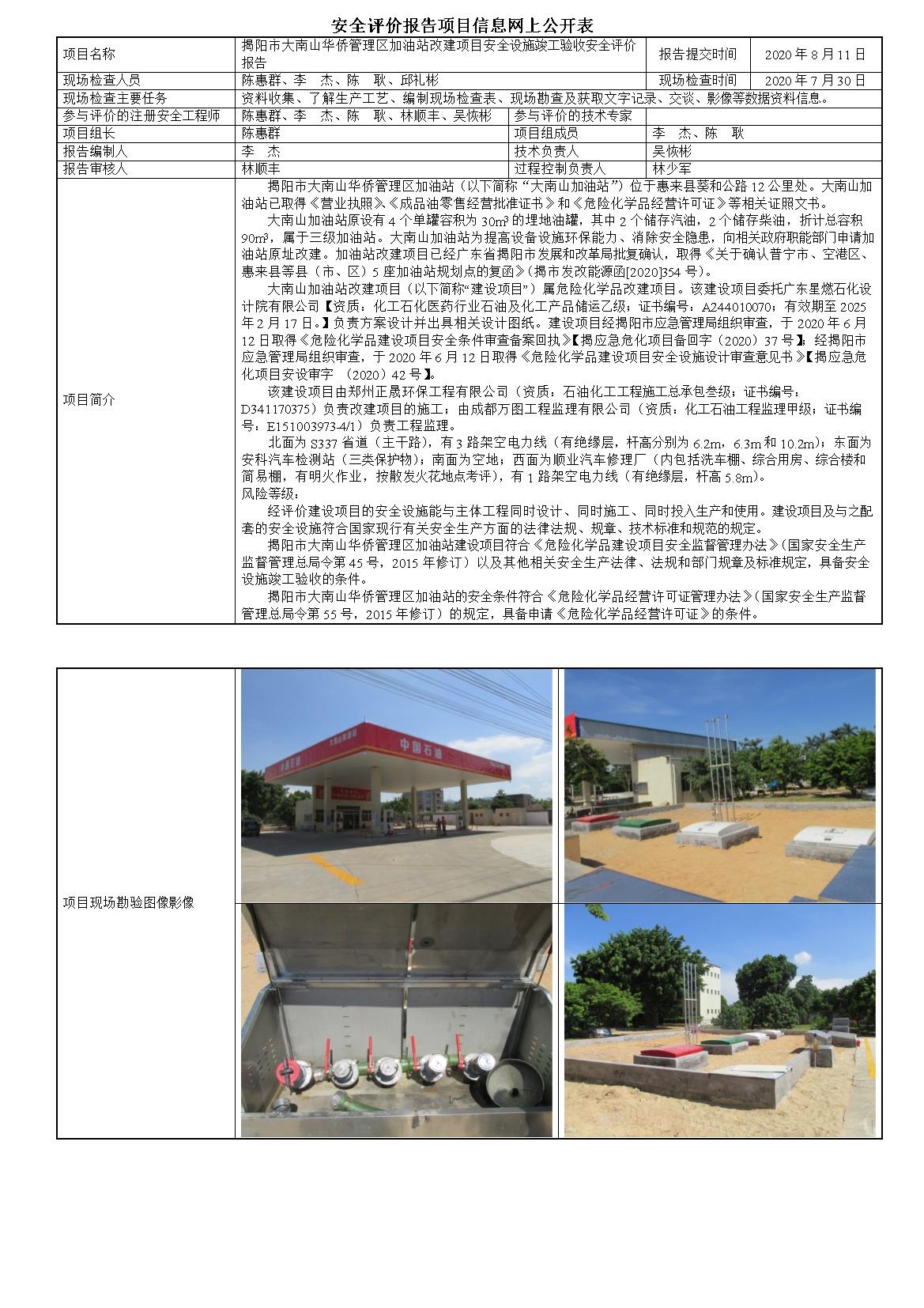 揭阳市大南山华侨管理区加油站改建项目安全设施竣工验收安全评价