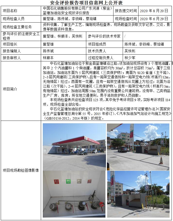 中国石化销售股份有限公司广东河源(紫金)蓝塘加油站安全现状评价