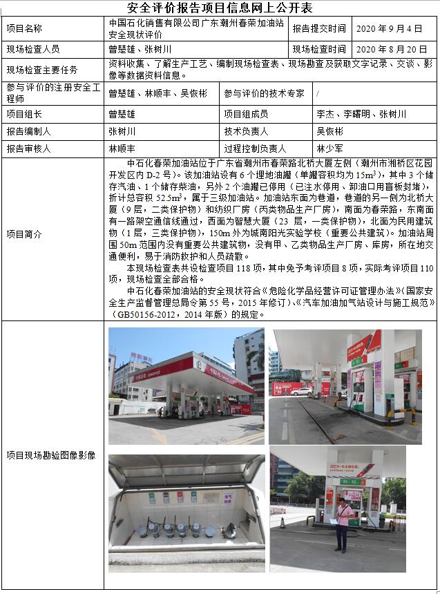 中国石化销售有限公司广东潮州春荣加油站安全现状评价