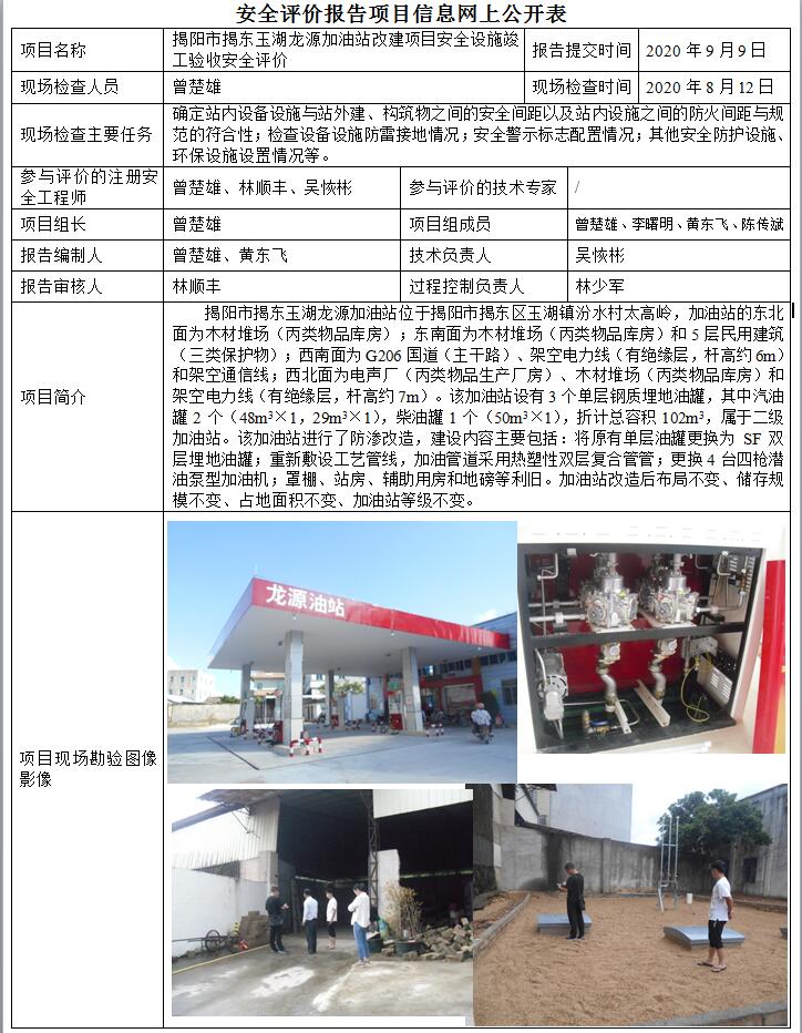 揭阳市揭东玉湖龙源加油站改建项目安全设施竣工验收安全评价