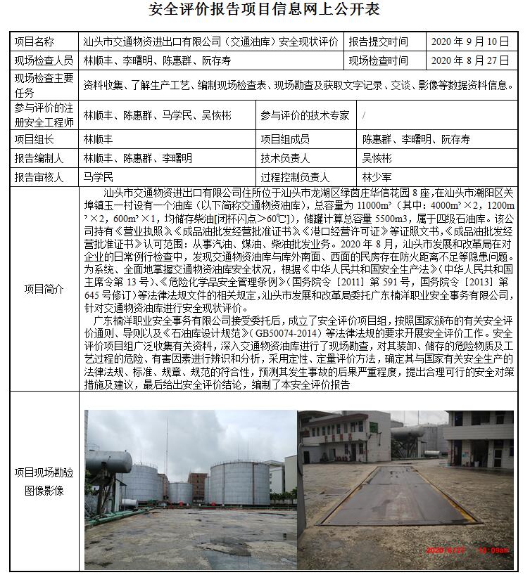 汕头市交通物资进出口有限公司交通物资油库安全现状评价
